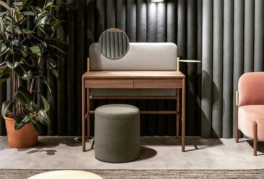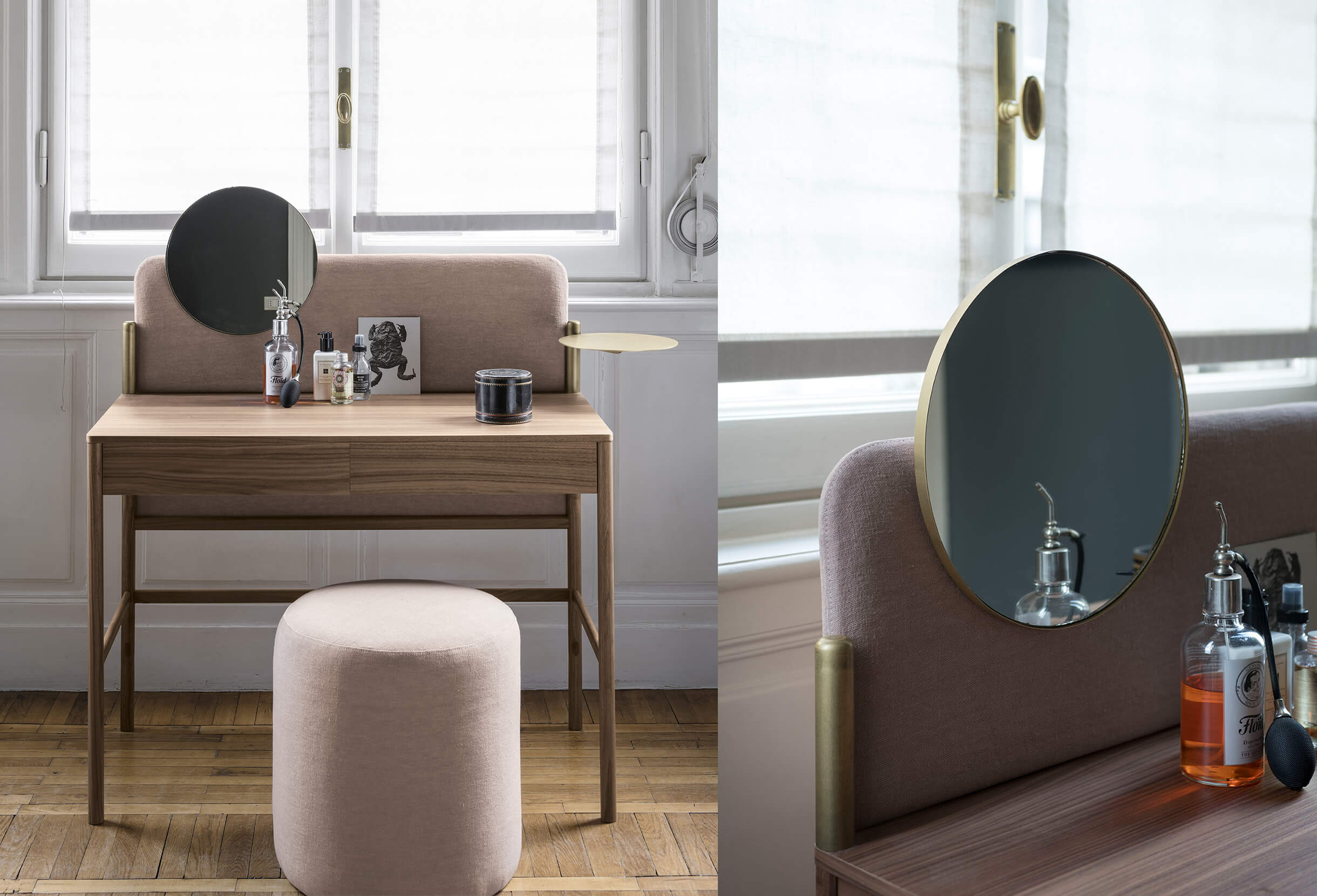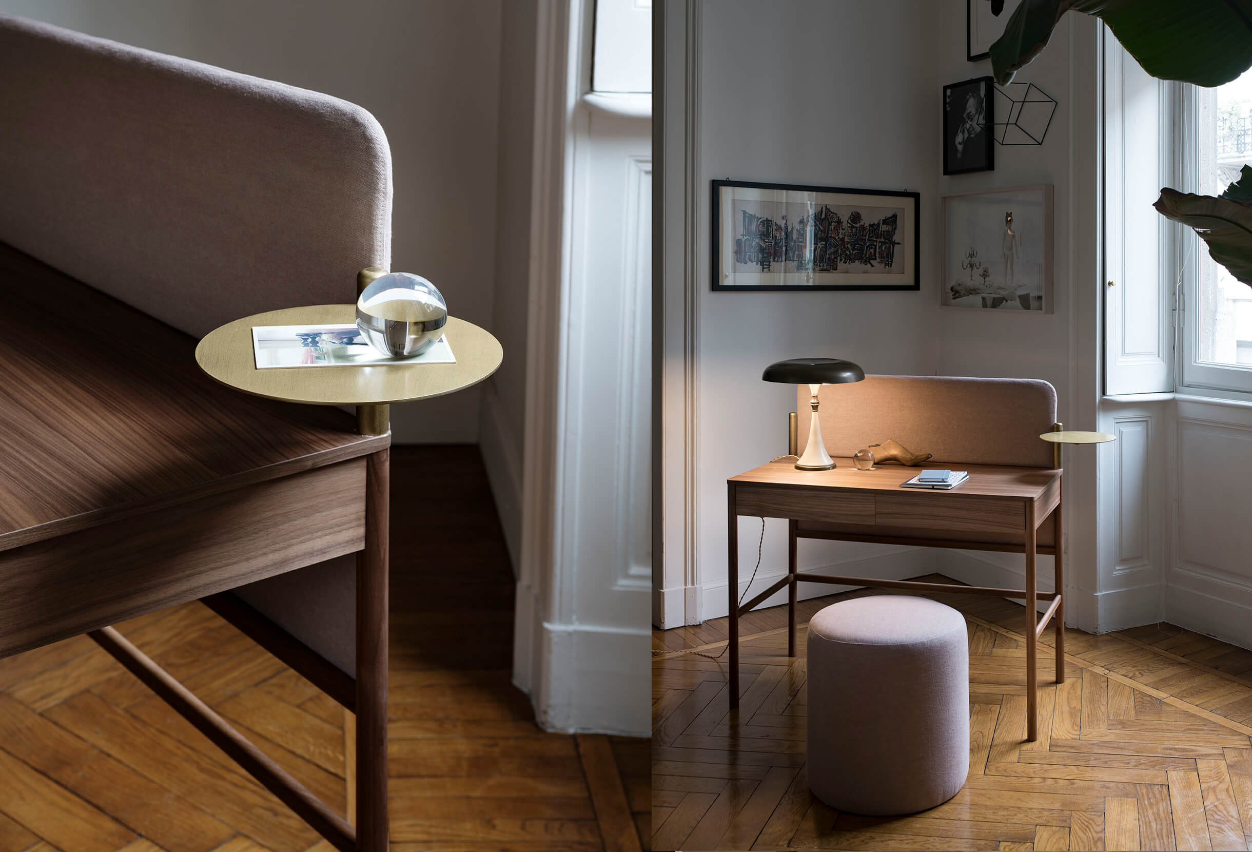 Flag is an elegant desk / vanity characterised by a walnut structure with a padded bottom panel. As with the rest of the collection, it is possible to customise it with a mirror, a rotating tray, and covered drawers with jewel holder divider.