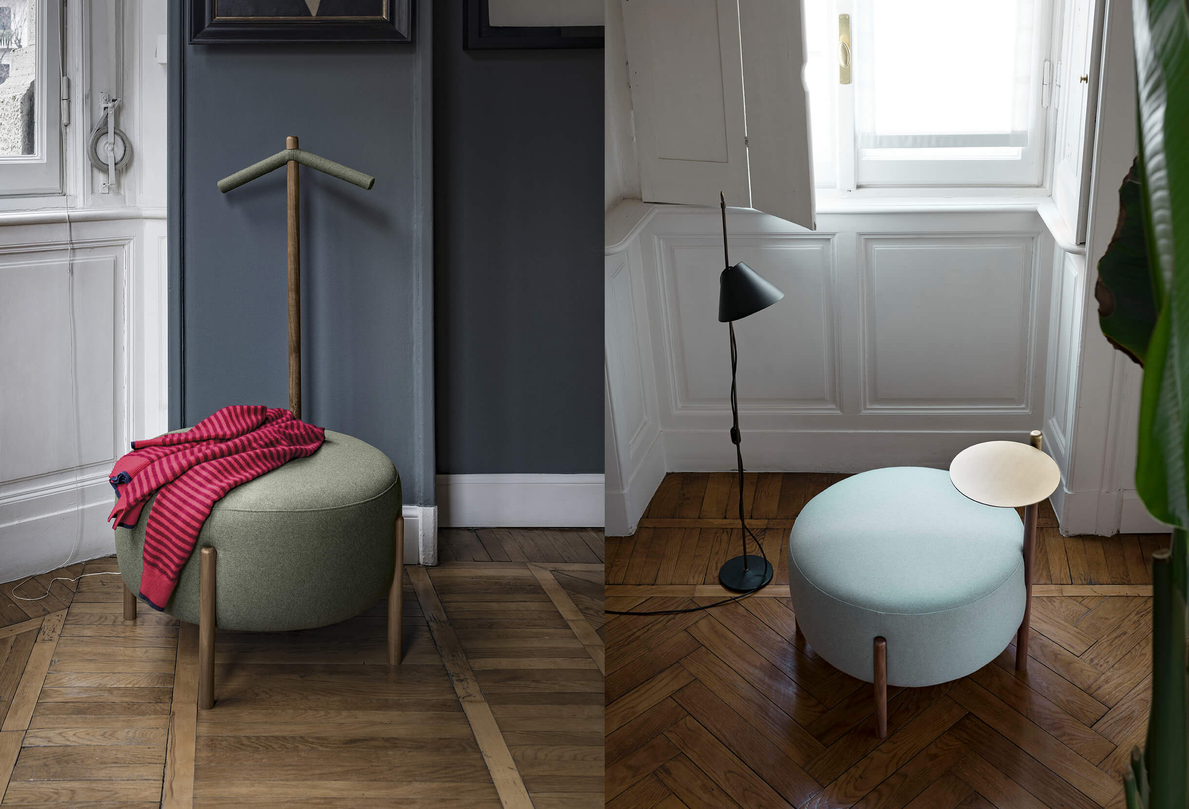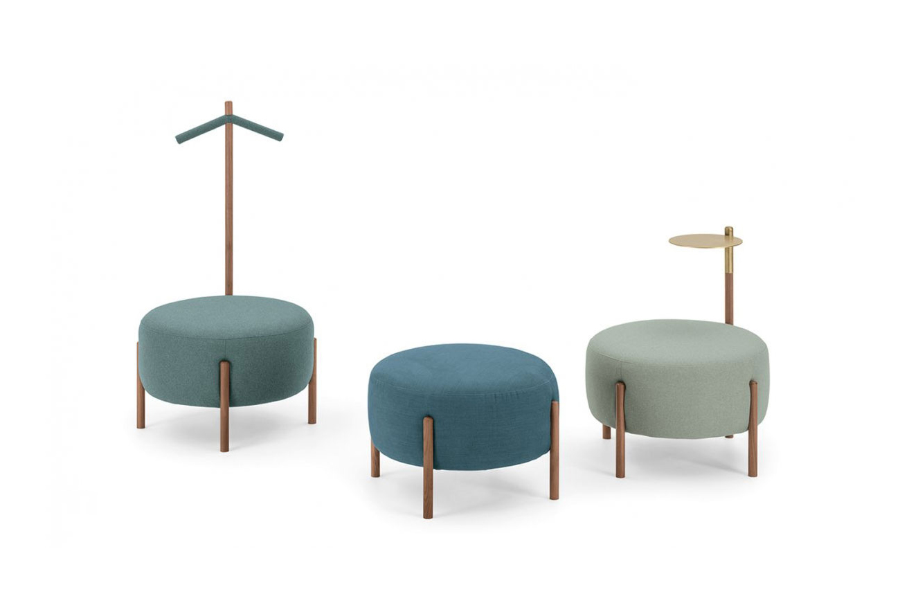 Series of poufs that can be combined with Flag bed, due to their aesthetics and versatility. It is possible to enrich the basic model with two useful accessories: a brass tray or a convenient clothes hanger.