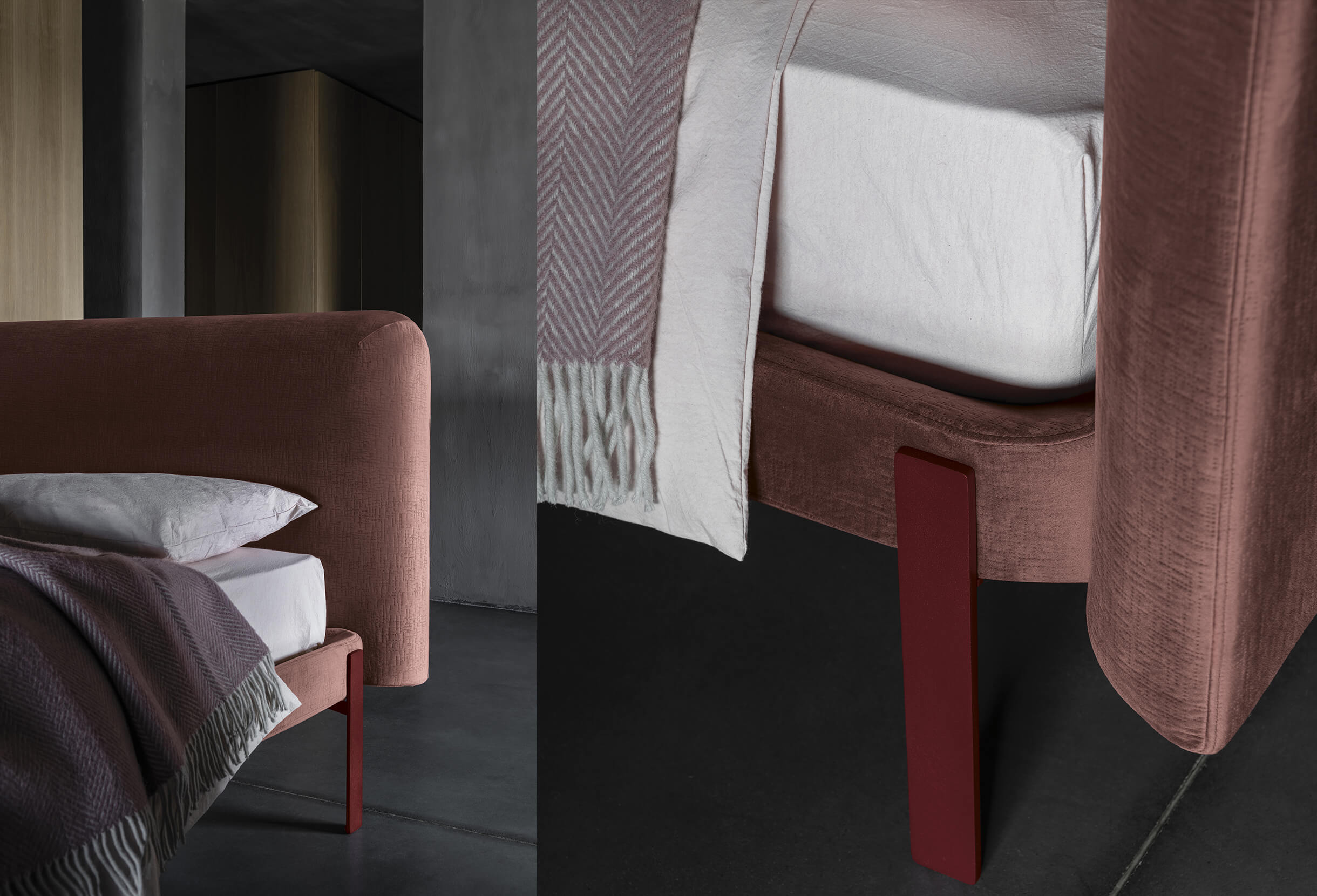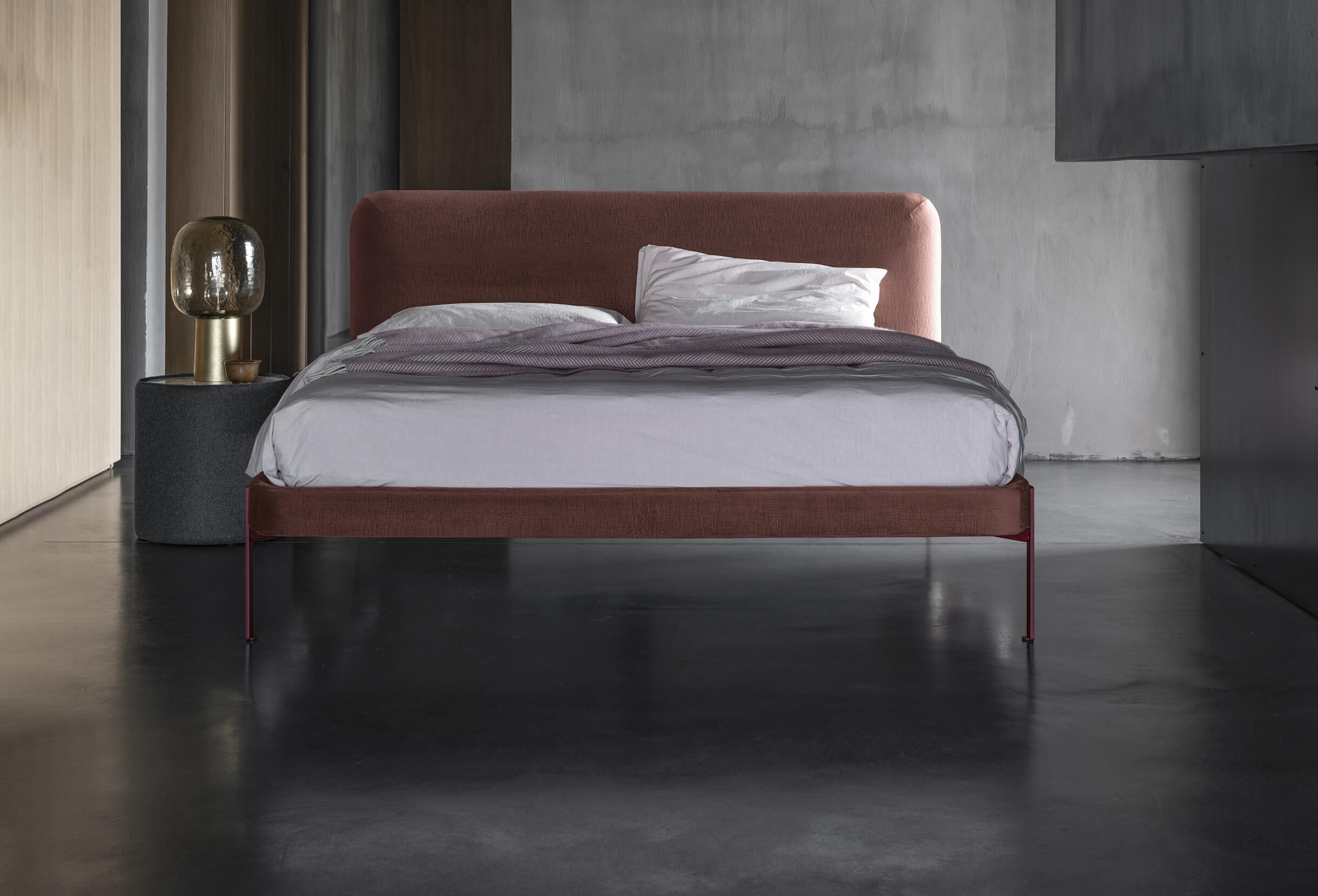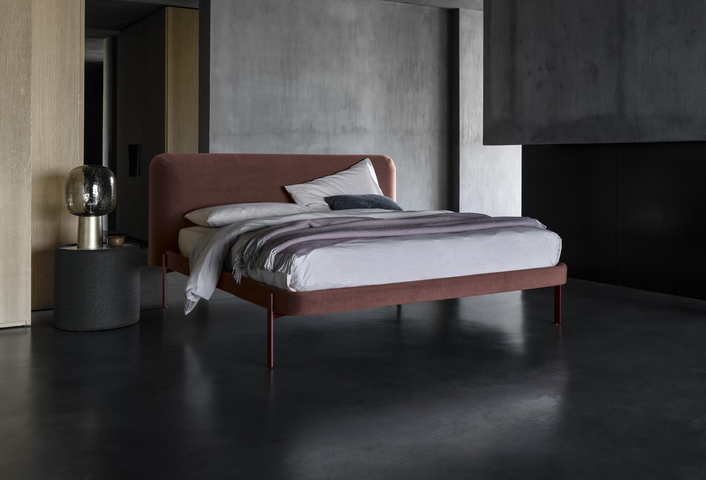 Devoted to the pleasure of enjoying the nightlife, Joy plays with the opposition between the soft and important volume of the headboard and the bed frame, and the thin and geometric metallic legs. The result is a pleasant and light feeling, with an additional touch of glamorous elegance, due to the possibility to customise its fabrics and colors.