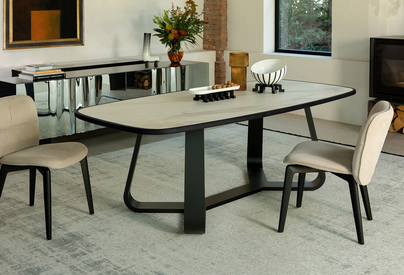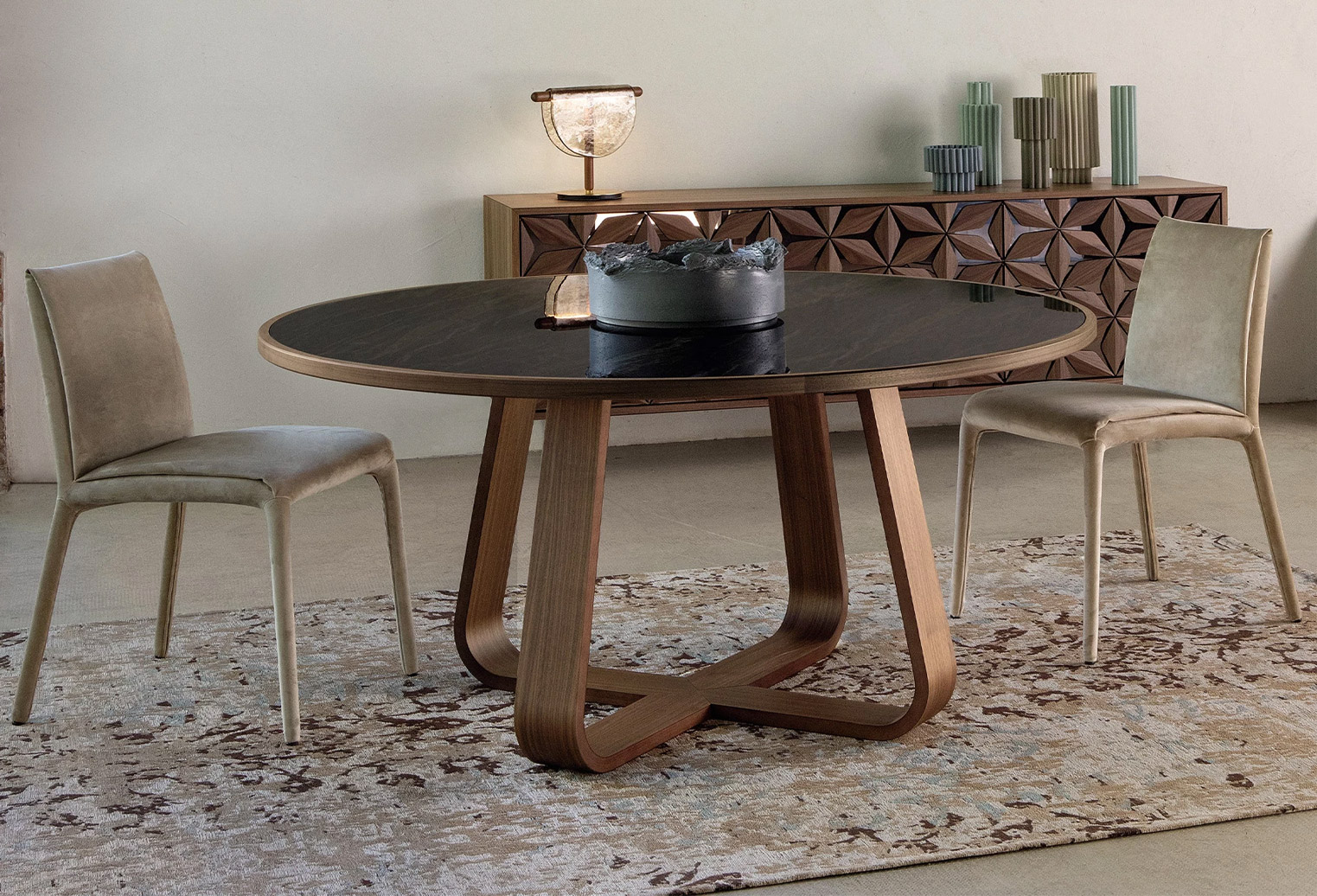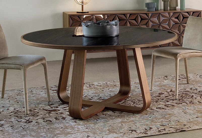 The elegant charm of Branch arises from the precious combination of precious materials that compose it: the thermo-curved wooden structure meets the porcelain top embellished by a sinuous solid wood frame.