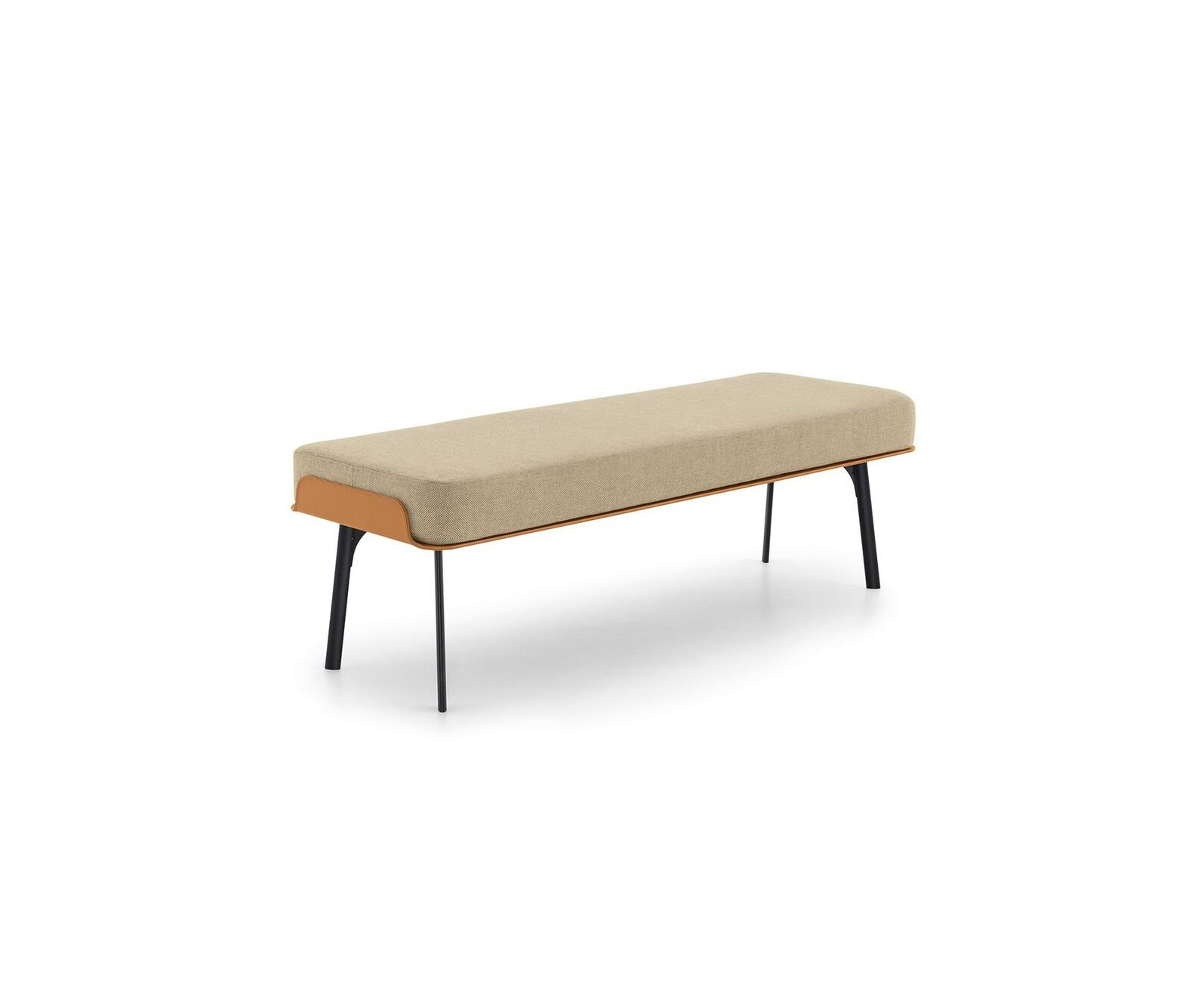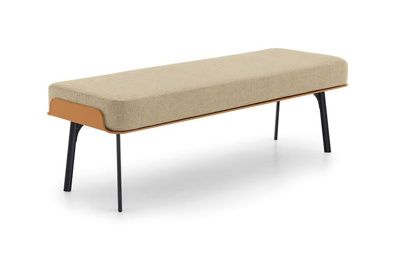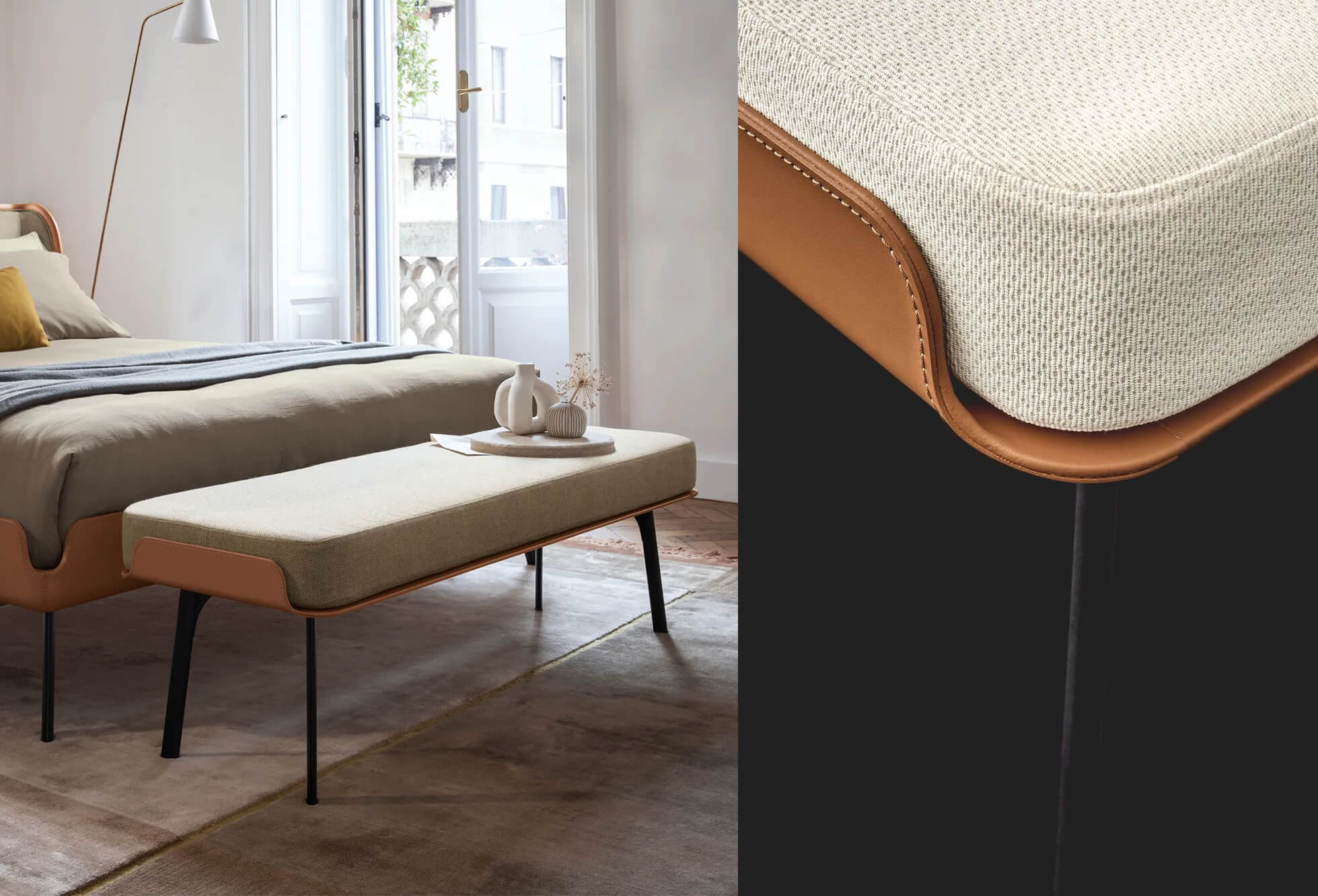 The bench comes from the soft, organic lines that design the Gabri bed. It features a leather base with attention to detail, which wraps around the comfortable seat covered in fabric.