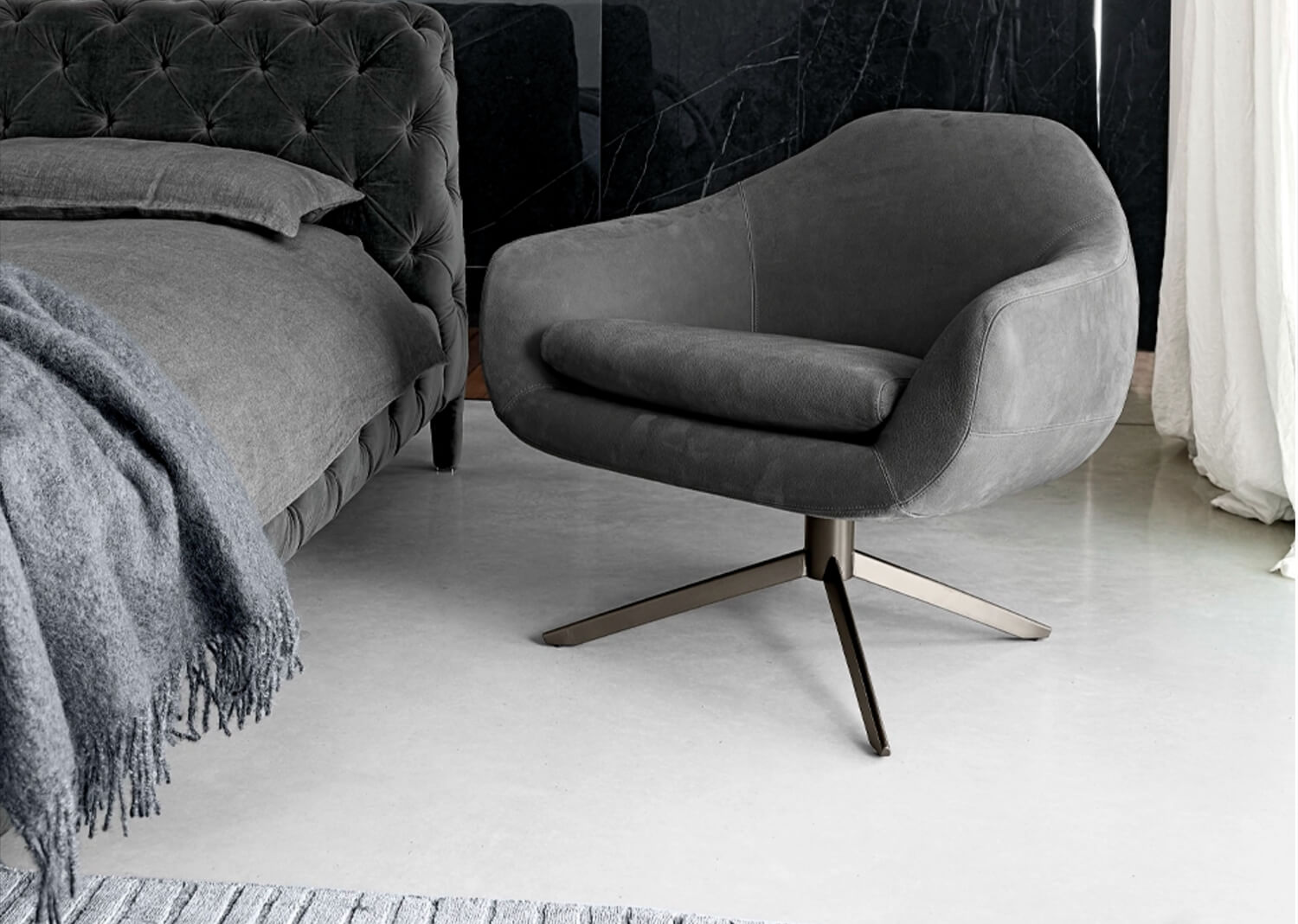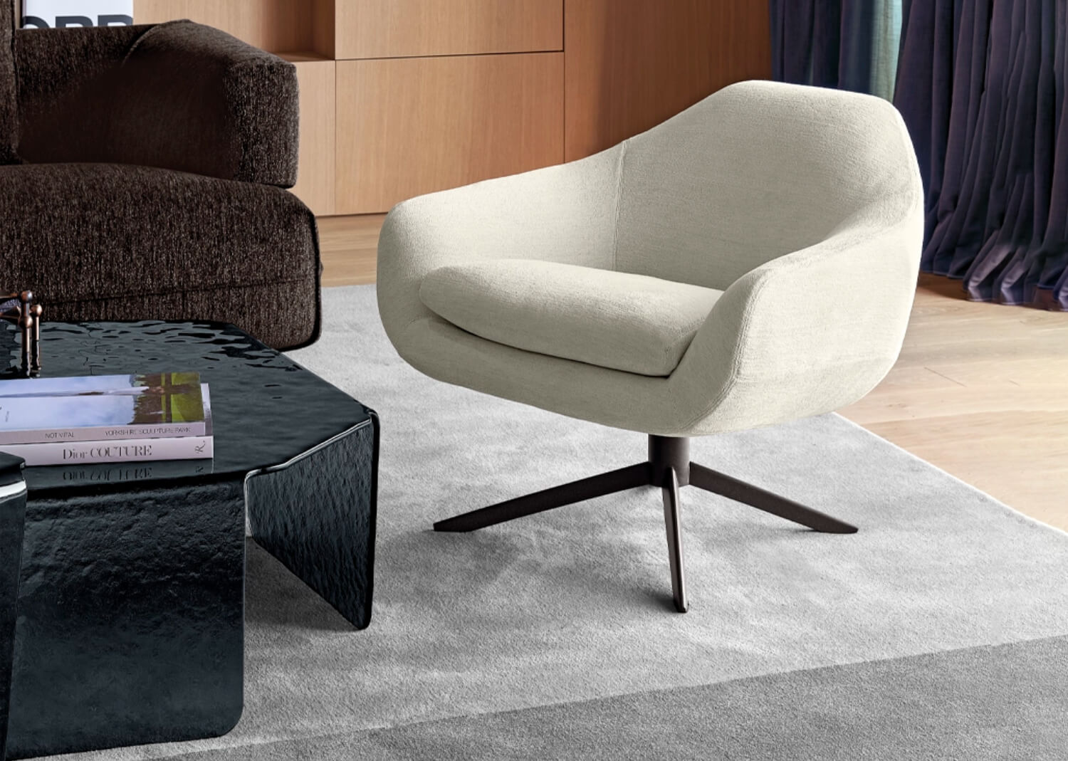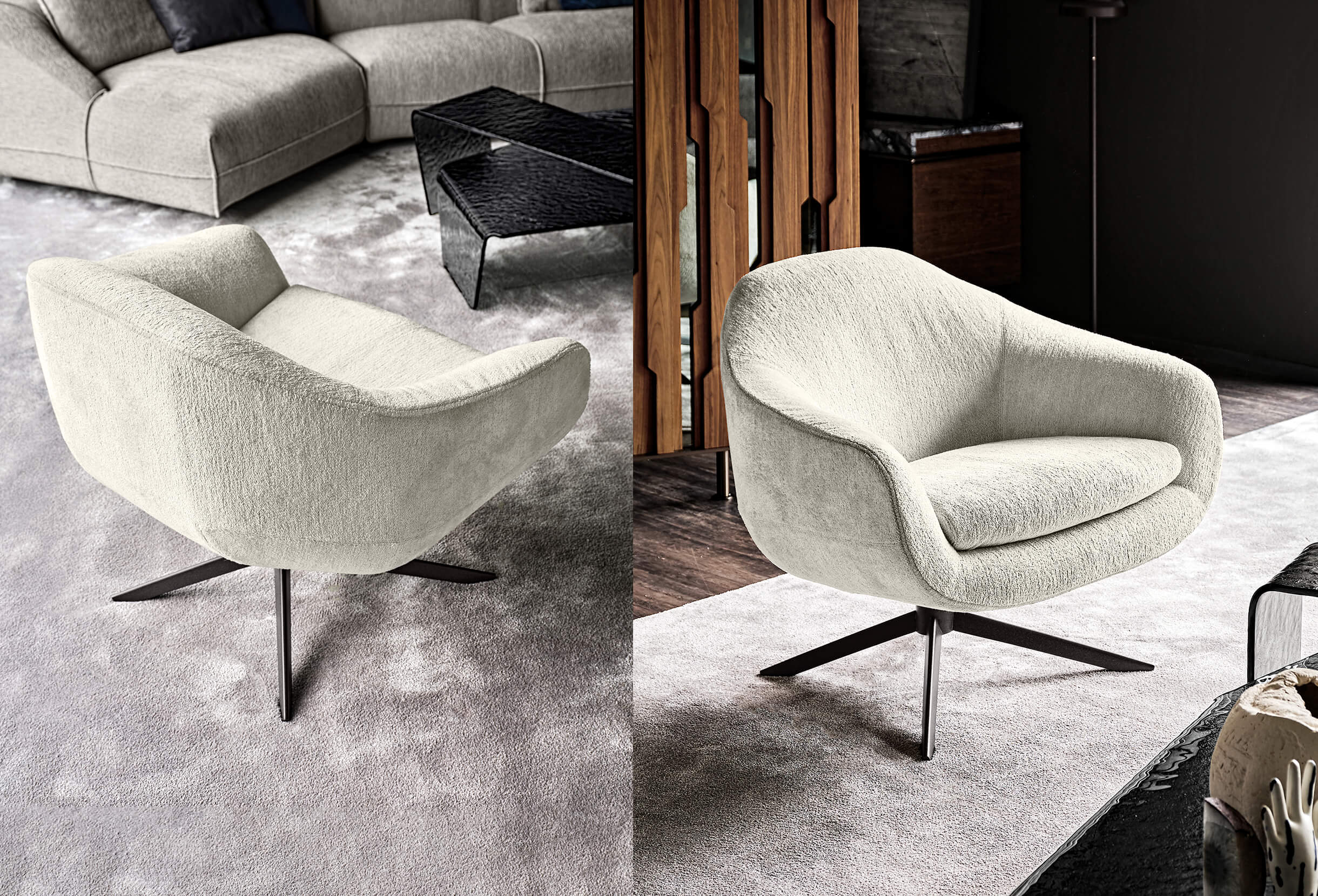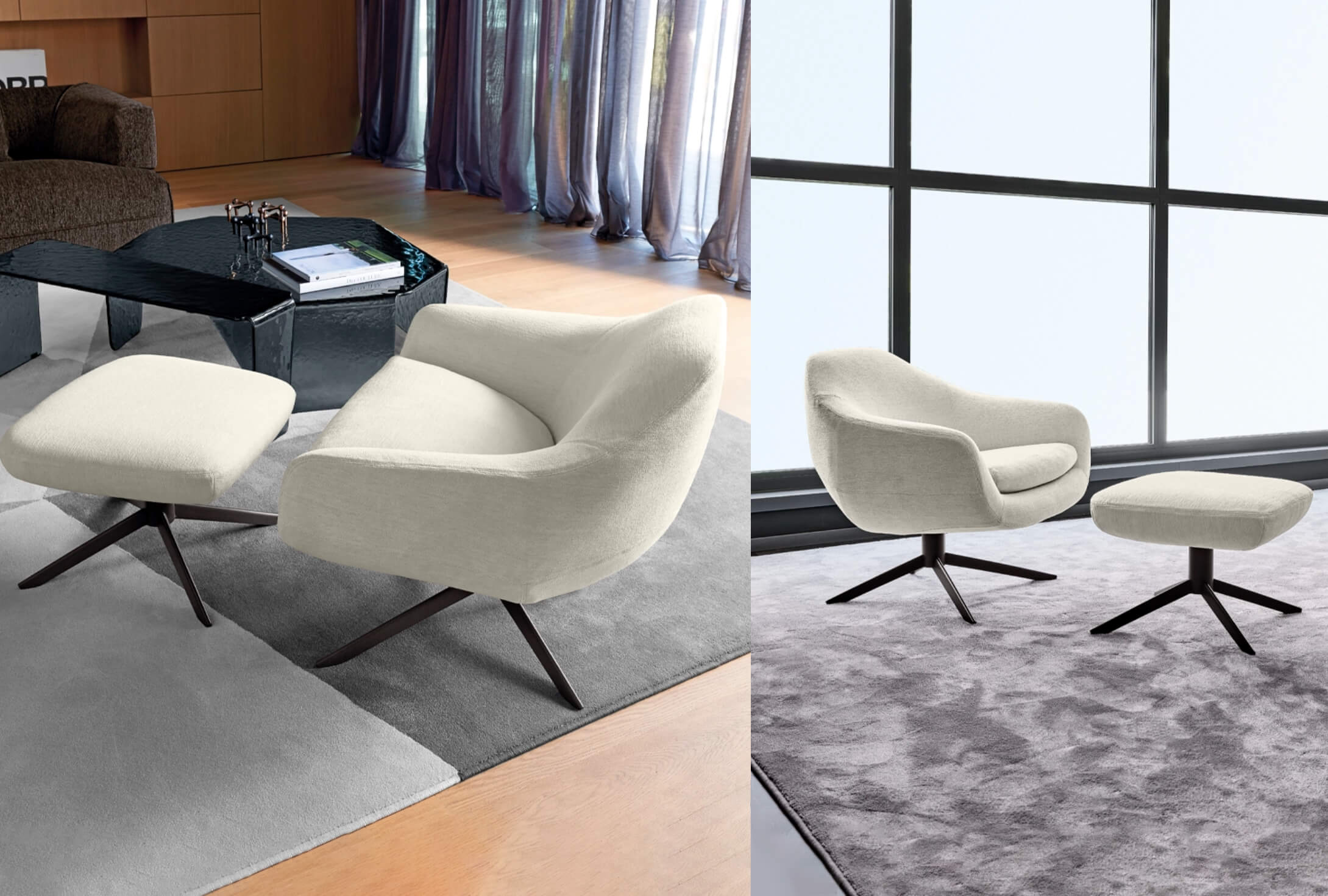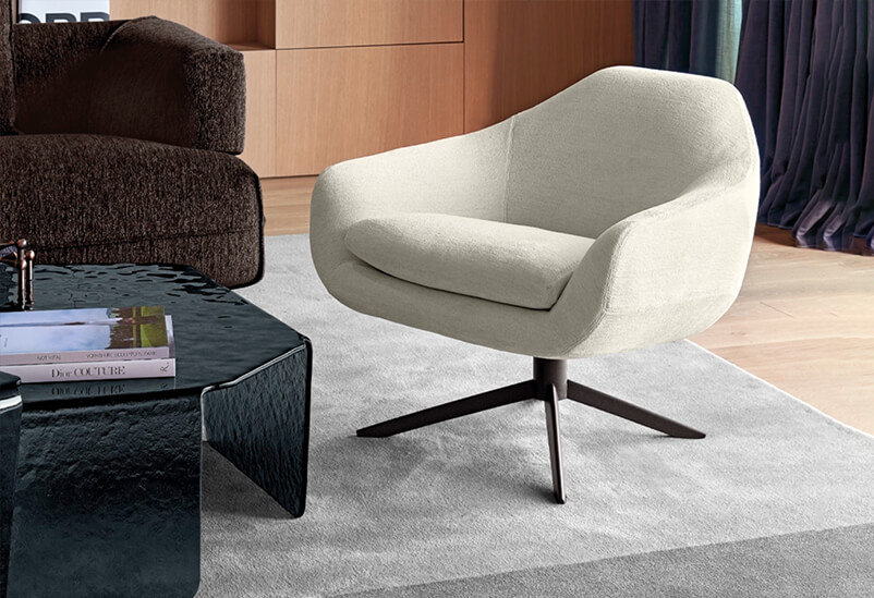 Designed by Dainelli Studio, Bond is a sleek, architectural armchair with a light, refined presence. A slim metal frame supports its precisely upholstered forms, creating a clean, modern statement. The armchair can be paired with its coordinated pouf, extending comfort while maintaining its minimalist aesthetic.