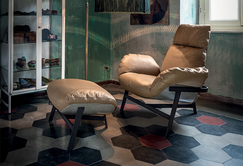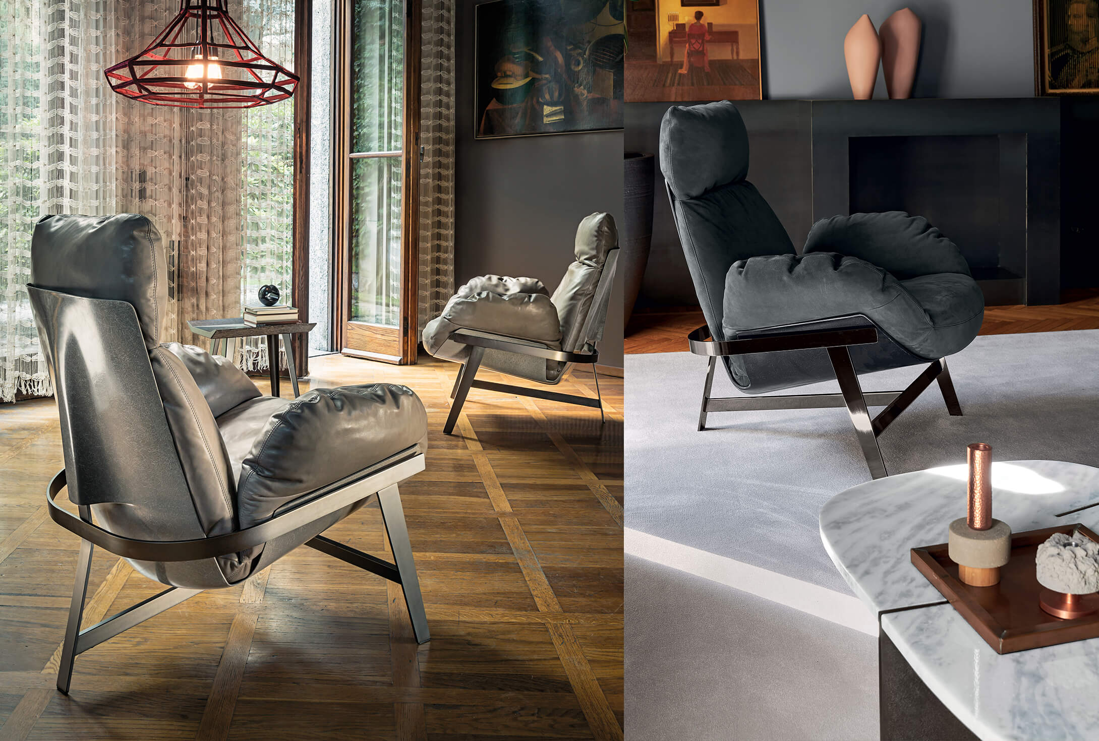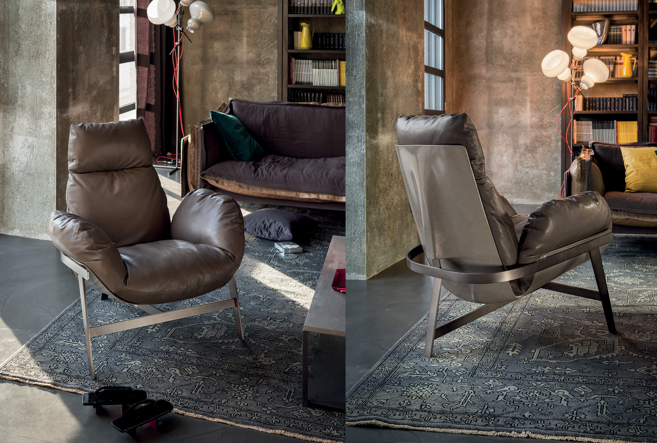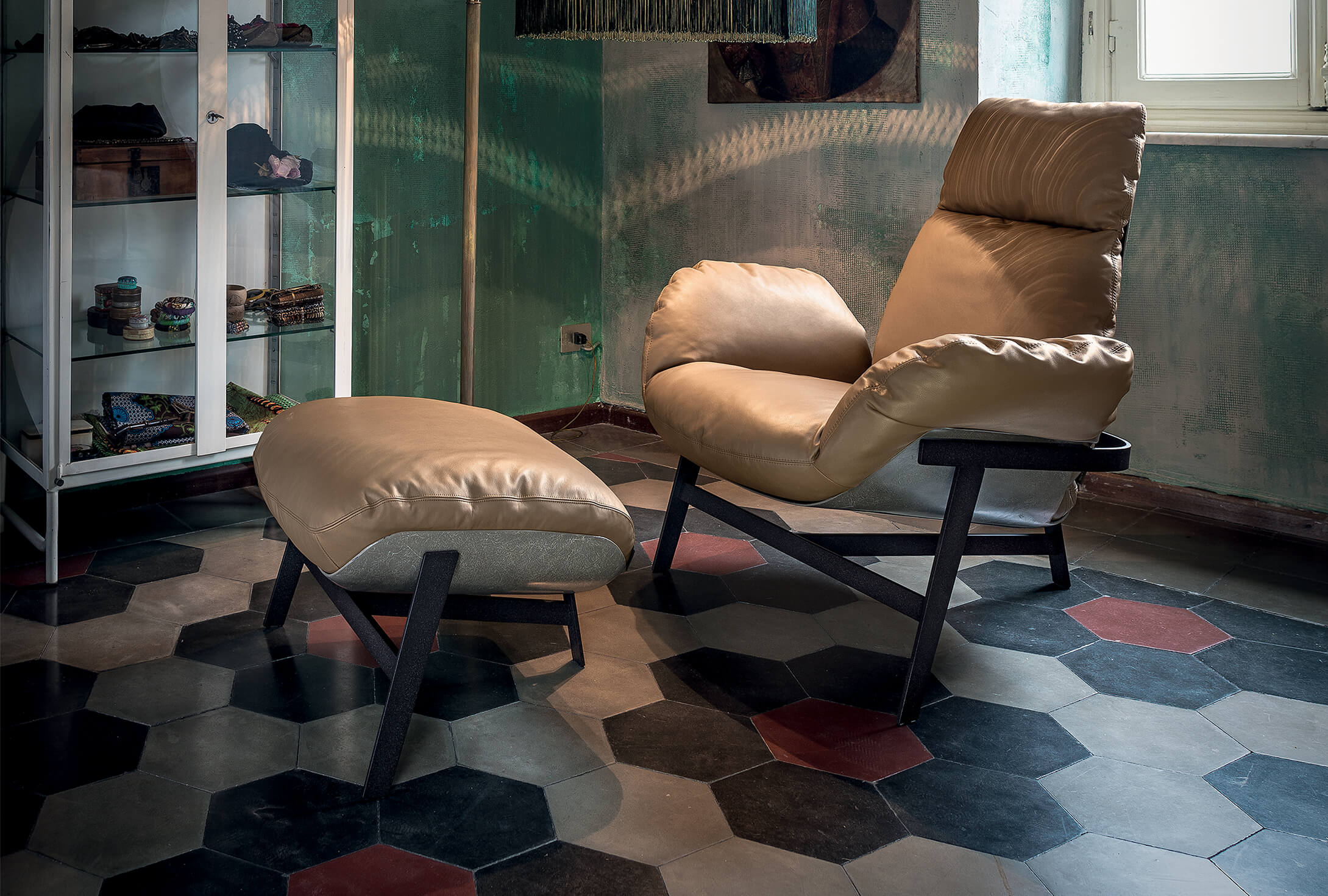 Jupiter, by Mauro Lipparini, features a sculptural, tapered silhouette and impeccable tailoring. Its smooth, flowing lines bring quiet elegance to any room. A matching footrest is available, allowing the piece to function as a complete, luxurious lounge ensemble.