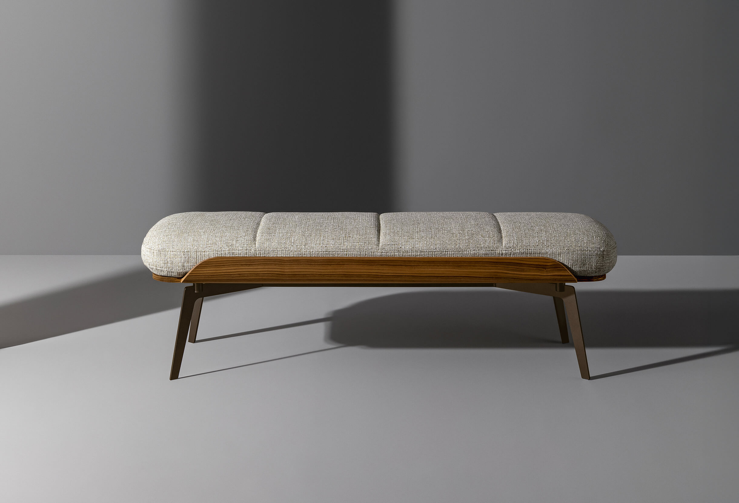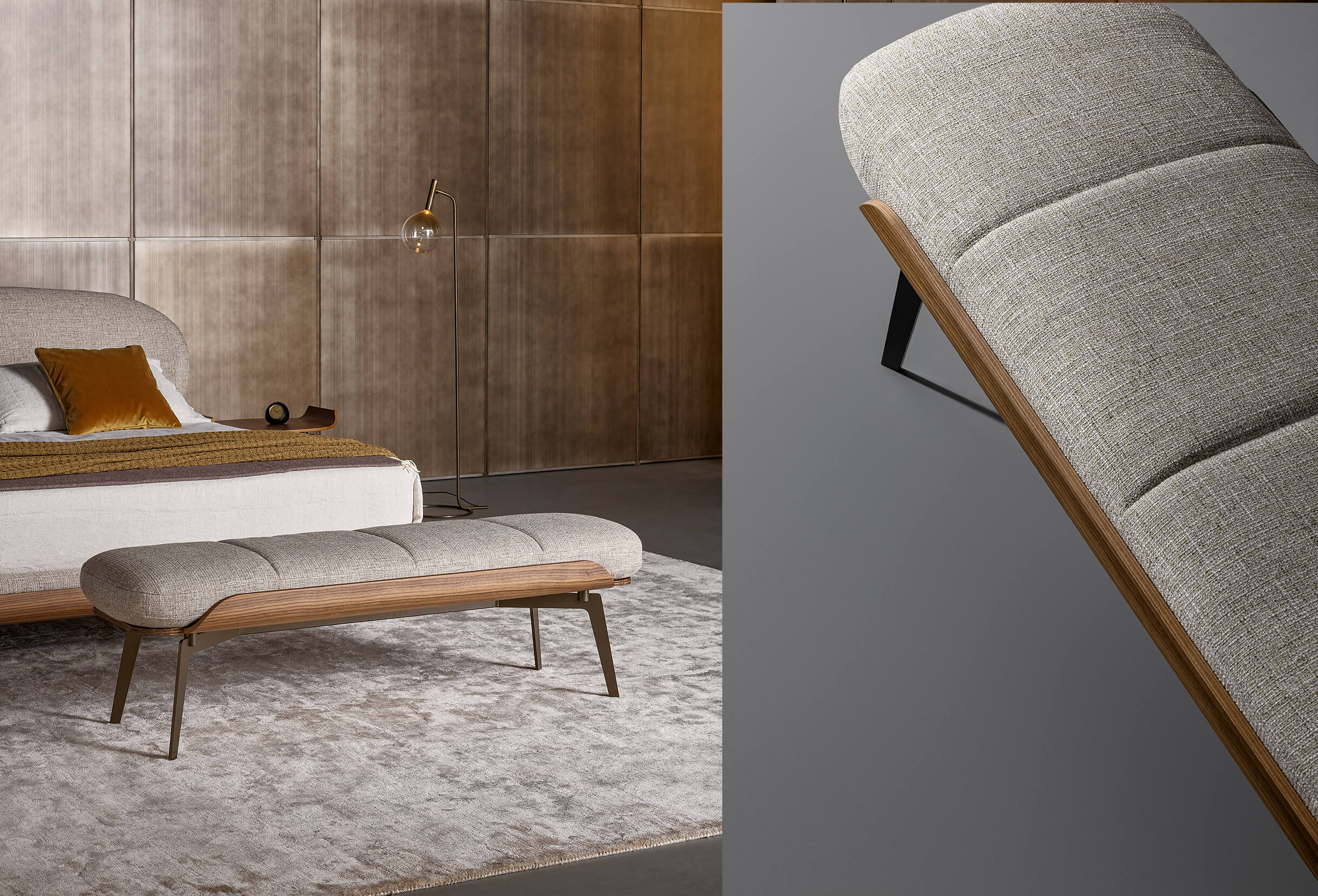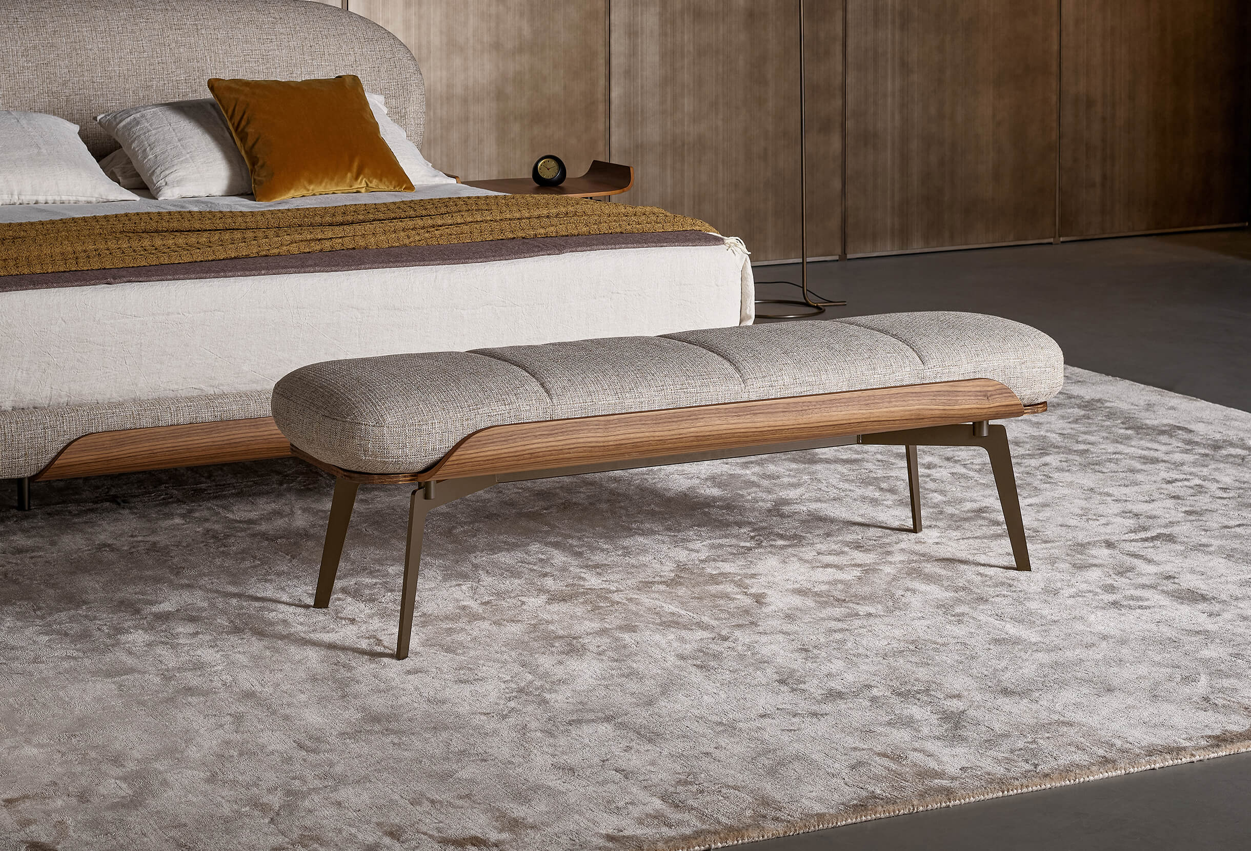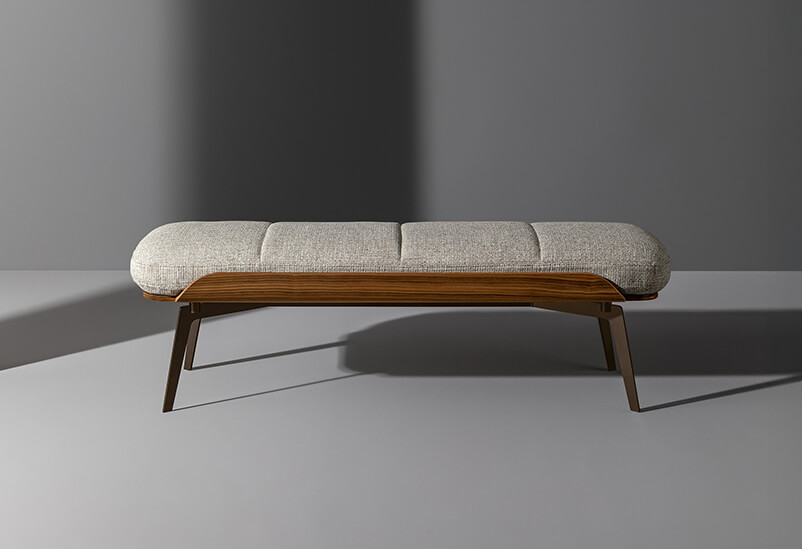 The Olos family also consists of a bench notable for its generous padding, while what really catches the attention is the side detail in curved wood, the common thread that runs through the whole collection and which hints at Nordic inspiration with its sober details and harmony of volumes. The end-of-bed bench for bedroom is supported by slender metal legs that fit discreetly into the overall design. The Olos bench completes the collection designed by Mauro Lipparini for the sleeping area, making it even more comfortable and functional.